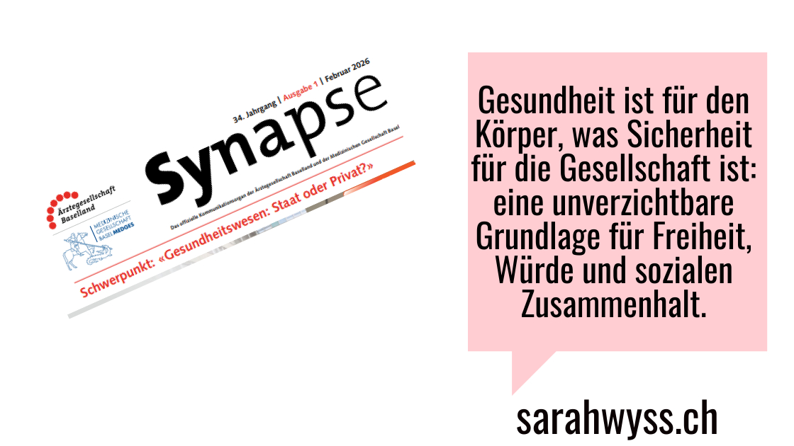 Bei der Sicherheit ist anerkannt, dass es sich um eine selbstverständliche staatliche Kernaufgabe handelt, während Gesundheit häufig als primär private Verantwortung dargestellt wird. Krankheit ist aber kein individuelles Versagen, sondern Teil der menschlichen Existenz. Und Gesundheit ist ebenso existenziell wie Sicherheit – und verdient deshalb einen vergleichbaren Stellenwert in Finanzierung, Organisation und politischer Verantwortung.